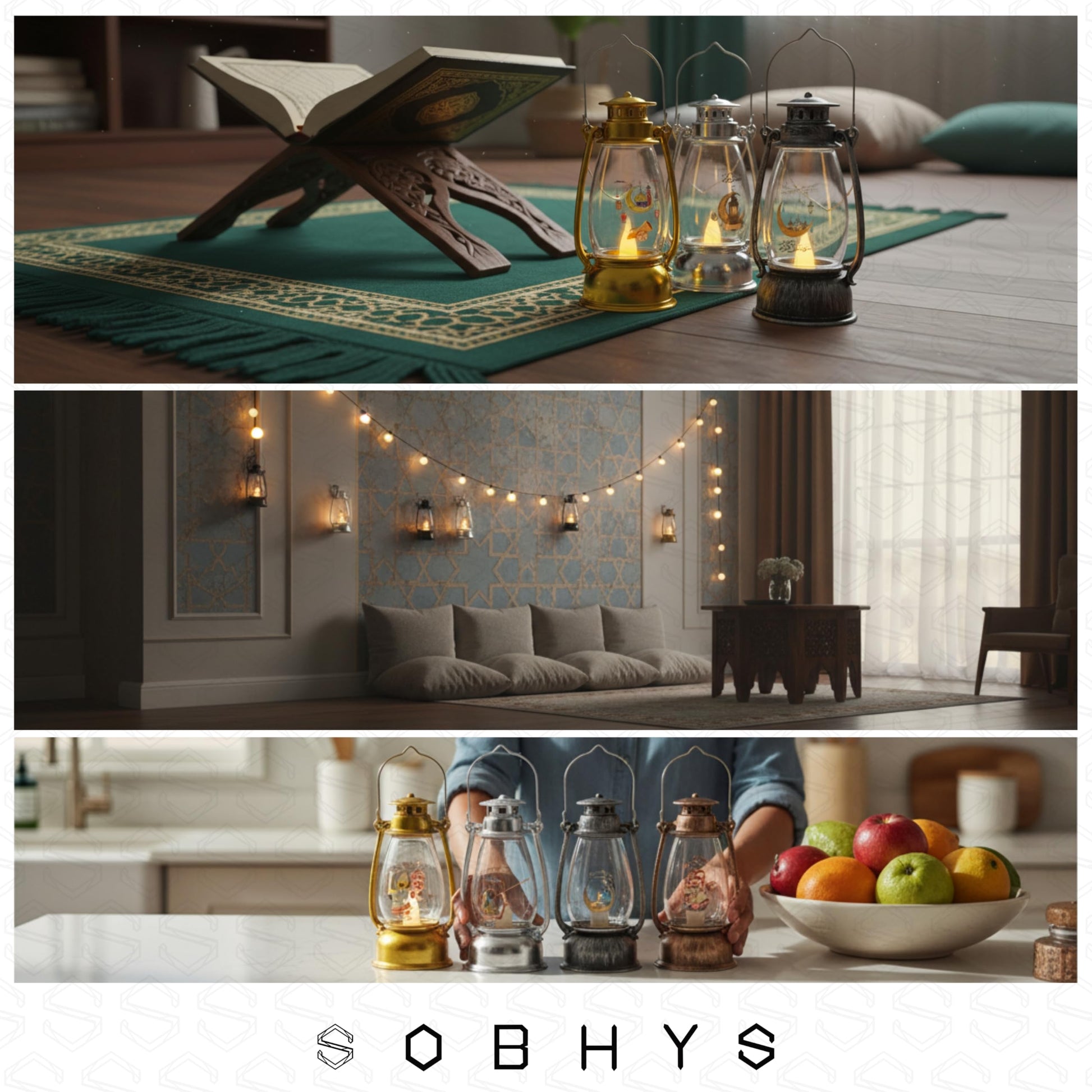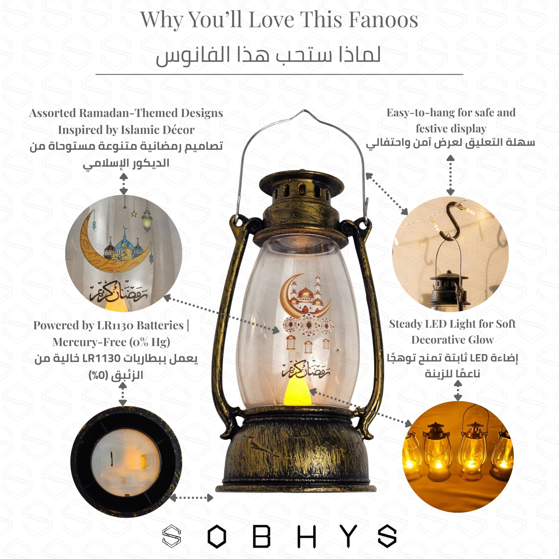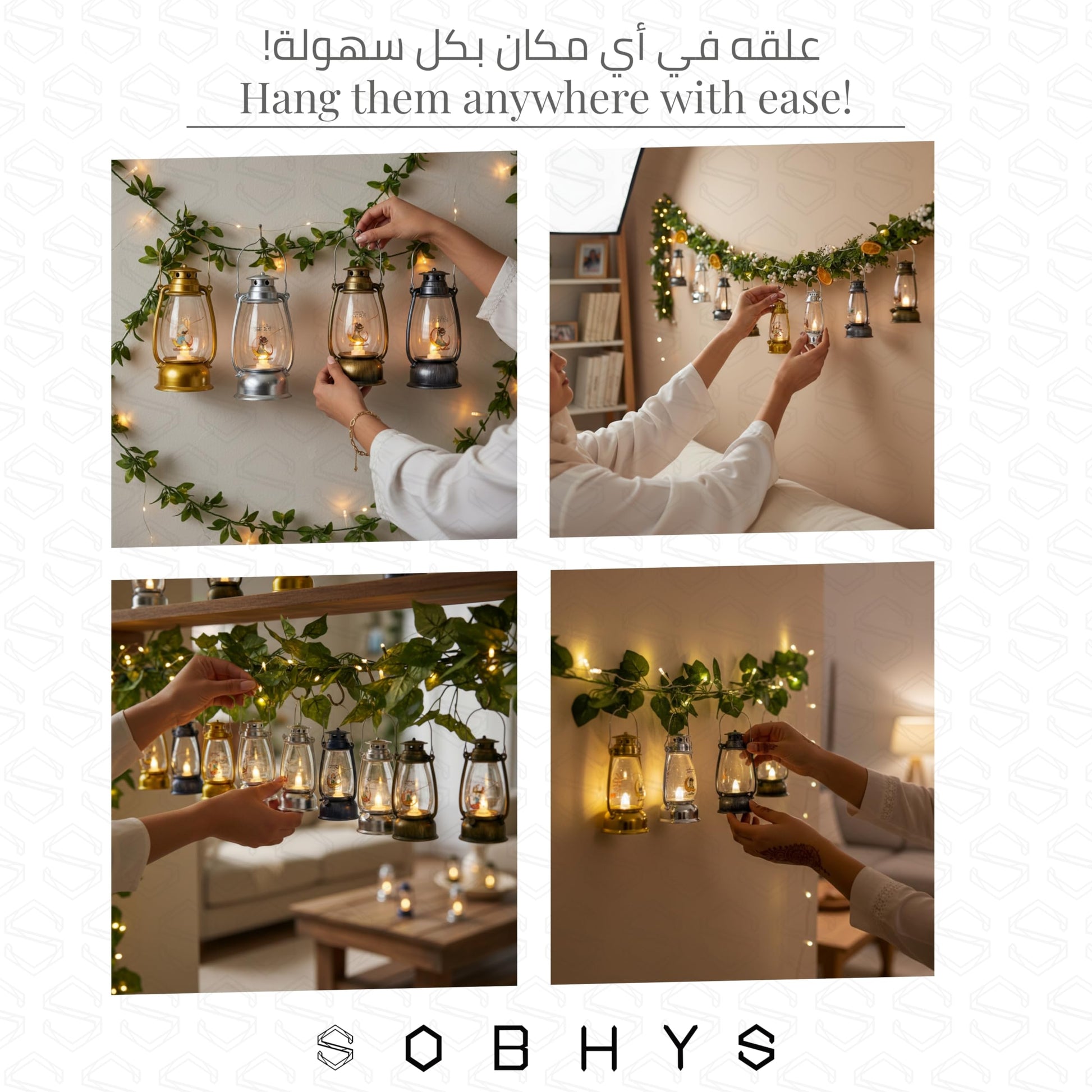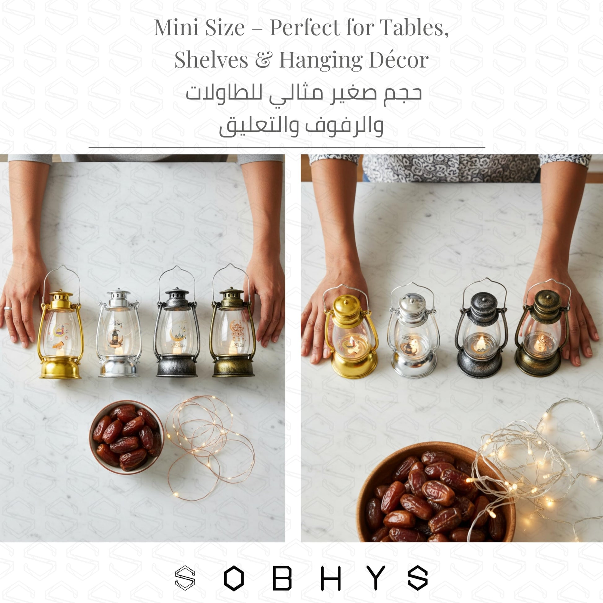This enchanting mini Ramadan Fanoos lantern set brings the warmth and spirit of the holy month into your home with authentic charm. Each set includes four beautifully crafted decorative lanterns in assorted metallic finishes—gold, silver, black, and bronze—featuring traditional lantern designs that evoke nostalgic memories of Ramadan celebrations. Measuring 17 centimetres in height and 6 centimetres in width, these compact lanterns are perfectly sized for versatile placement on tables, shelves, or hanging as festive décor throughout your home. The clear glass body of each lantern showcases assorted Ramadan-themed designs inspired by Islamic décor, including crescent moons, mosques, and Arabic calligraphy that celebrate the blessed month. Powered by mercury-free LR1130 batteries, the steady LED light creates a soft, decorative glow that adds ambience without the worry of open flames. The convenient hanging handle makes these lanterns easy to display safely, whether suspended from hooks or placed on surfaces. This versatile set transforms any space into a welcoming Ramadan atmosphere, making it an ideal addition to your seasonal decorations or a thoughtful gift for loved ones celebrating this special time. Product images are digitally enhanced using AI to illustrate usage scenarios. The actual product design, materials, and proportions remain unchanged.