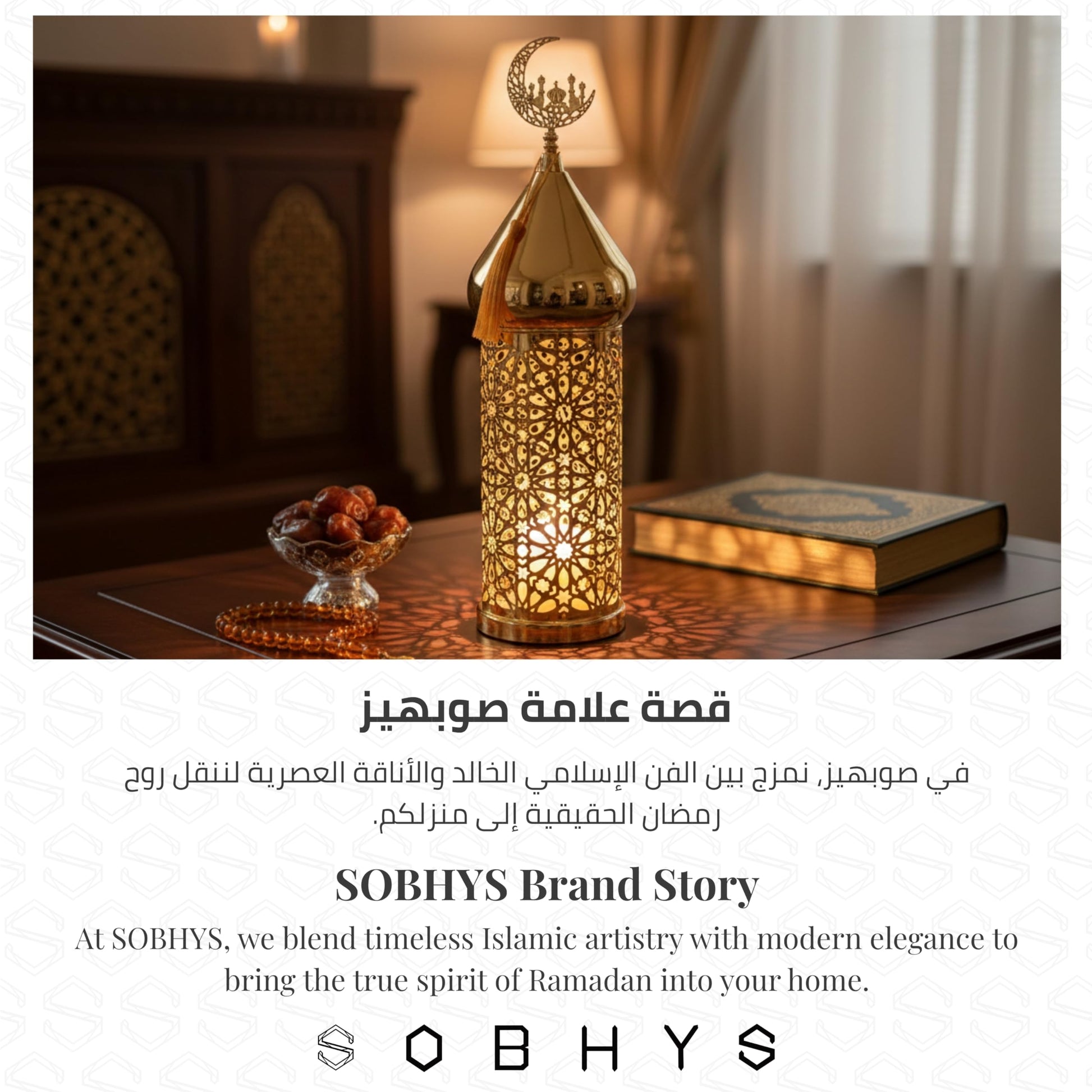 This exquisite SOBHYS Premium Ramadan lantern brings the timeless elegance of Islamic architecture into your home. The large-size fanoos features a stunning gold-plated metal body adorned with intricate geometric patterns inspired by traditional Islamic design, creating a captivating display that honours the spirit of Ramadan. Standing at an impressive 45 centimetres tall with a diameter of 10.5 centimetres, this decorative lantern makes a striking centrepiece for your majlis, dining table, or entryway. The cylindrical body showcases delicate cutwork that allows light to filter through in mesmerising patterns, whilst the distinctive dome-shaped top is crowned with an ornamental crescent moon finial. Powered by three AAA batteries (1.5V), the adjustable LED strip inside provides warm, ambient illumination without the hazards of open flames. The crescent finial is packed separately and simply inserts and rotates to lock securely in place. Whether displayed individually or arranged in pairs and trios with other sizes from the collection, this premium lantern transforms any space into a welcoming sanctuary during the holy month and beyond. Each size is sold separately, allowing you to create your perfect arrangement.