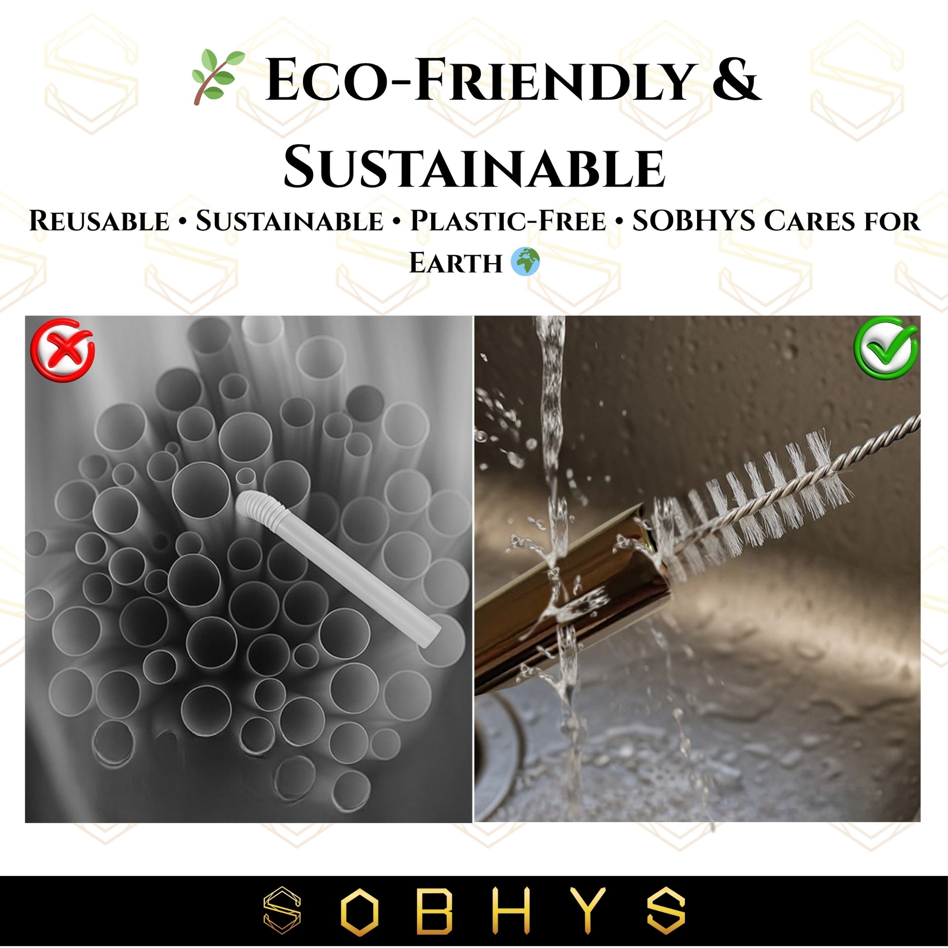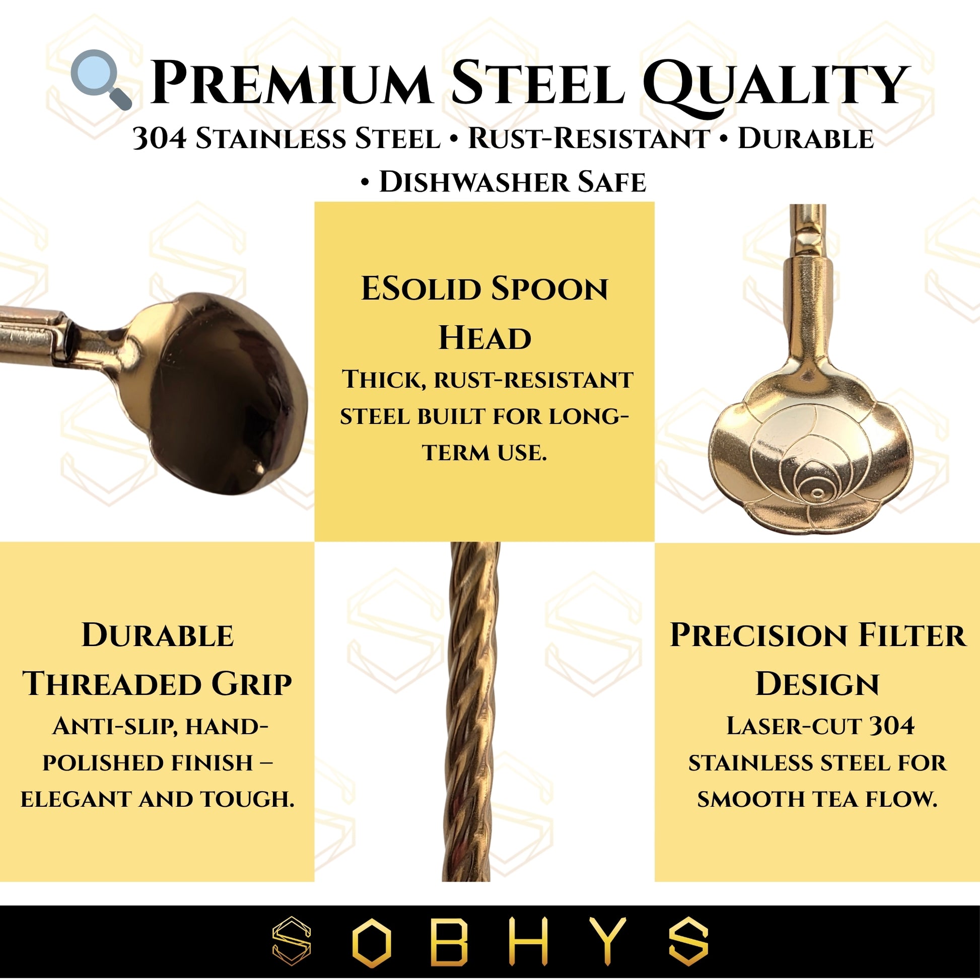 SOBHYS Premium Stainless Steel Spoon Straws Set, 304 Grade Steel, 21.5 cm Length, Rust-Resistant Filter Design, Silver, 6-Pack with Cleaning Brush, Dishwasher Safe (Golden-Spoon)