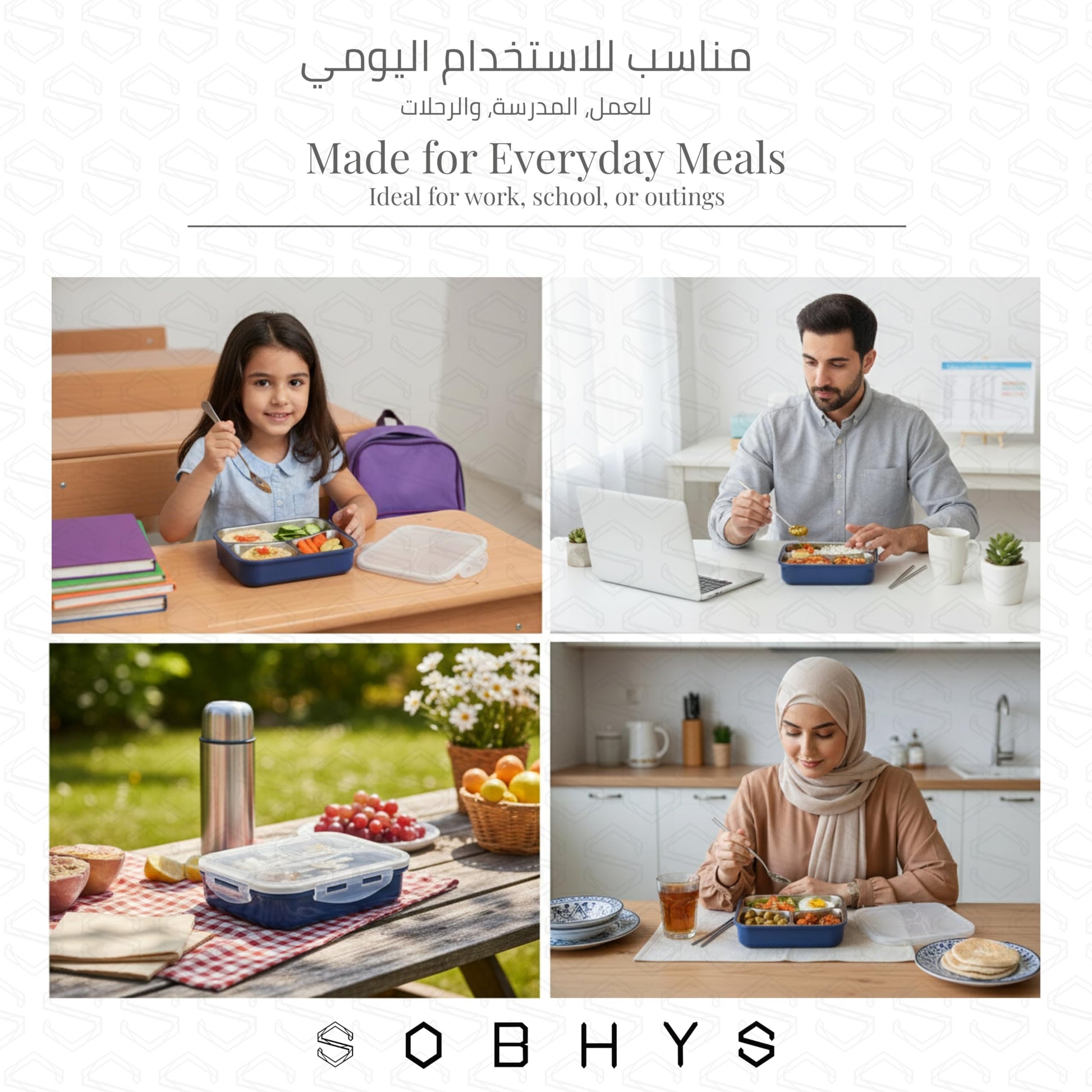 The SOBHYS Stainless Steel Lunch Box is your perfect companion for enjoying fresh, home-prepared meals wherever your day takes you. This thoughtfully designed meal container features a premium SUS304 stainless steel inner tray with three separate compartments, allowing you to pack a variety of foods whilst keeping flavours distinct. The removable inner tray makes cleaning effortless and ensures durability for years of daily use. Measuring 19 cm x 14 cm x 5 cm, this compact lunch box fits comfortably in most bags whilst providing ample space for a satisfying meal. The leak-resistant silicone seal keeps your food secure during transport, preventing spills and maintaining freshness. Available in four attractive colours to suit your personal style, each lunch box comes complete with a stainless steel spoon (17 cm) and chopsticks (3 cm handle width), so you're always ready to eat. Whether you're heading to work, school, or enjoying outdoor activities, this versatile lunch box combines functionality with style, making meal prep and transport simple and convenient. Product images are digitally enhanced using AI to illustrate usage scenarios. The actual product design, materials, and proportions remain unchanged.