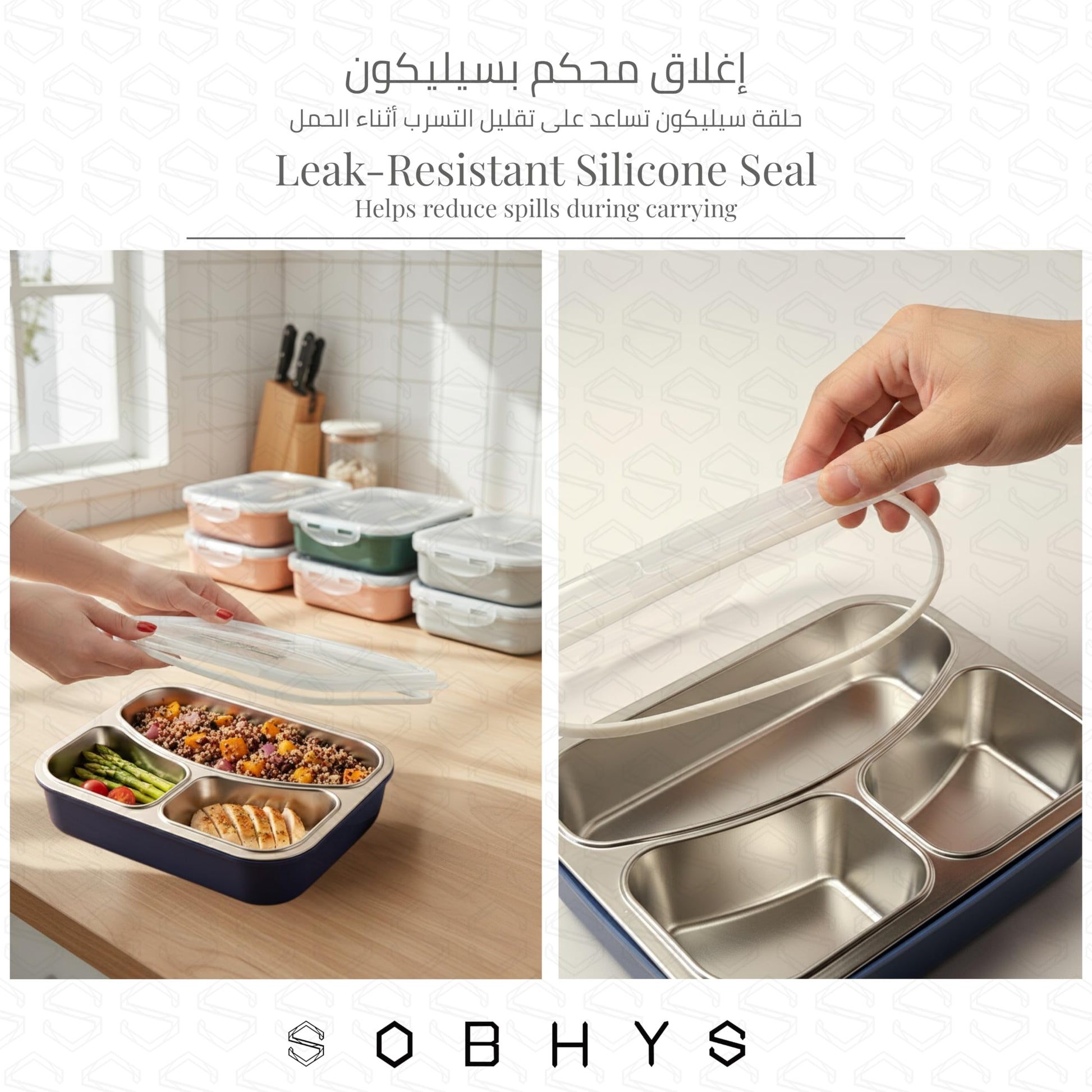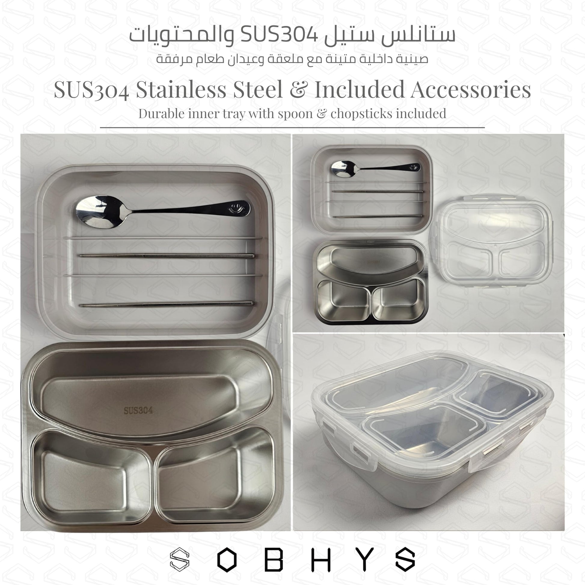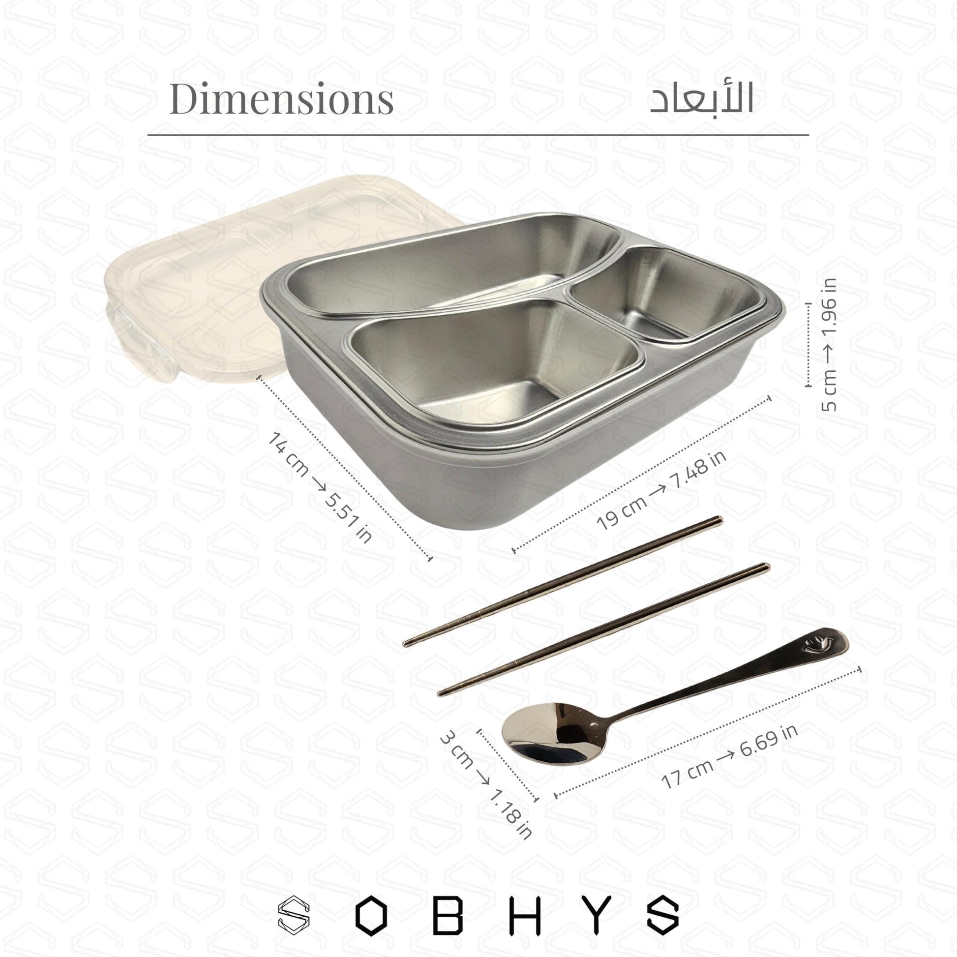 The SOBHYS Stainless Steel Lunch Box is your perfect companion for enjoying fresh, home-prepared meals wherever your day takes you. This thoughtfully designed meal container features a premium SUS304 stainless steel inner tray with three separate compartments, allowing you to pack a variety of foods whilst keeping flavours distinct. The removable inner tray makes cleaning effortless and ensures durability for years of daily use. Measuring 19 cm x 14 cm x 5 cm, this compact lunch box fits comfortably in most bags whilst providing ample space for a satisfying meal. The leak-resistant silicone seal keeps your food secure during transport, preventing spills and maintaining freshness. Available in four attractive colours to suit your personal style, each lunch box comes complete with a stainless steel spoon (17 cm) and chopsticks (3 cm handle width), so you're always ready to eat. Whether you're heading to work, school, or enjoying outdoor activities, this versatile lunch box combines functionality with style, making meal prep and transport simple and convenient. Product images are digitally enhanced using AI to illustrate usage scenarios. The actual product design, materials, and proportions remain unchanged.