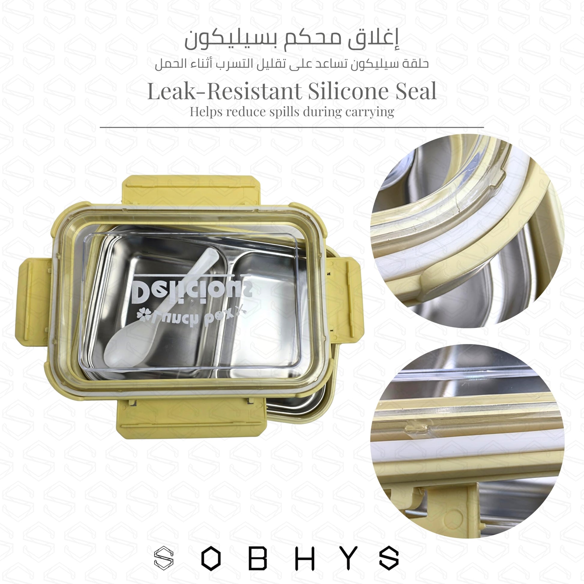 The SOBHYS Stainless Steel Lunch Box is the perfect companion for those who value fresh, home-cooked meals on the go. This thoughtfully designed food container features a durable stainless steel construction with a removable inner tray, making it easy to pack different foods separately and clean thoroughly after use. The leak-resistant silicone seal helps reduce spills during carrying, ensuring your bag stays clean and your meals stay secure whether you're heading to work, school, or outdoor activities. With 2 convenient compartments measuring 19 × 14 × 5 cm, you can organise your lunch efficiently, keeping different dishes separate until you're ready to eat. The included spoon adds extra convenience, so you'll always have cutlery on hand. Available in three attractive colours to suit your personal style, this reusable lunch box is built to last and designed for everyday use. Choose the colour that matches your taste and enjoy the benefits of a practical, well-sealed meal container that keeps your food fresh and your lifestyle organised.